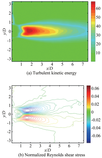 | 图 4 脉动速度场的湍动能和归一化雷诺剪切应力 Fig.4 Turbulent kinetic energy and normalized Reynolds shear stress |