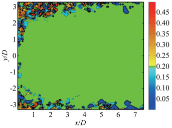 图 5给出了圆柱绕流速度场的斯特劳哈尔数St=fD/U∞云图,其中f为功率谱密度的最大值对应的频率,即旋涡脱落频率。从图中可以看出,除了视场的上下边缘和前缘外,圆柱绕流尾迹中的斯特劳哈尔数稳定在0.2左右,这与文献[20-26]中报道的亚临界雷诺数条件下圆柱绕流的St≈0.20~0.21是一致的。