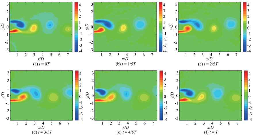 图 7和8分别给出了根据速度场之间的相关性确定的相位平均流线图和涡量图,从图中可以看到:(1)圆柱上、下两侧不断地有旋涡交替地生成,从圆柱表面脱落向下游发展并随着能量的衰竭而耗散,形成较规则的Karman涡街脱落。(2)在t=0T(T为圆柱尾涡脱落的周期)时刻,圆柱正后方约1.3D处存在1个顺时针旋转的大尺度旋涡,在旋涡附近存在负的涡量聚集区。在紧邻圆柱表面的右下方,1个逆时针旋转的小旋涡开始形成。(3)在t=1/5T时刻,顺时针旋转的大尺度旋涡沿流向明显拉伸并向四周扩散,其涡量降低并开始衰竭。圆柱下方的小旋涡进一步长大、涡量逐渐聚集并增大到最大值。(4)在t=2/5T时刻,圆柱右下方逆时针旋转的旋涡已经发展得非常饱满,成为大尺度旋涡,其中心位于圆柱正后方约1.0D的位置,正的涡量聚集区进一步发展。圆柱右上方t=0T时刻生成的大尺度旋涡已经扩散并向下游移动,涡量进一步降低、聚集区逐渐消失。此时,与圆柱表面相邻的右上方,1个新的旋涡结构开始酝酿形成。(5)在t=3/5T时刻,逆时针旋转的旋涡随着向下游流动,旋涡中心后移、涡量降低,开始进入被主流拉伸的初始阶段。圆柱右上方形成的小尺度旋涡继续长大。(6)在t=4/5T时刻,圆柱上方顺时针旋转的旋涡已经发展得比较饱满、其中心位于圆柱正后方约0.9D的位置,负的涡量聚集区进一步扩大。t=2/5T时刻发展得非常饱满的大尺度旋涡已经扩散并向下游移动,一个新的逆时针旋转的旋涡结构开始在紧邻圆柱的右下方酝酿形成。(7) t=T时刻的圆柱尾流特征,不论是流线还是涡量分布,都与t=0T时刻的尾流特征完全一致,圆柱绕流的旋涡演化过程完成1个完整的周期。