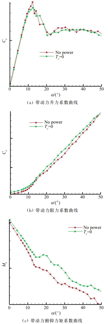 3 试验结果讨论 3.1 无动力条件下平尾深失速影响试验采用T型尾翼布局的潜在影响来自于深失速的流动状况,在机翼失速后的某个迎角范围内,平尾将会浸没在机翼尾流之中,此时平尾和升降舵的效率会显著降低,这给失速状态的改进增加了困难。