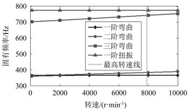 固定轴承外圈,约束所有节点的轴向移动自由度和绕轴向旋转自由度,采用阻尼方法进行模态分析,考虑回转效应,在静态坐标系下计算无阻尼横向弯曲固有频率随转速的变化情况,将计算结果整理后绘制Campbell图,如图 7所示。