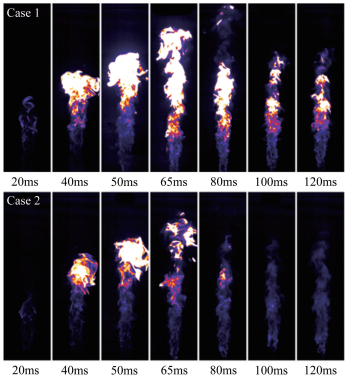 | 图 2 工况1和2的点火过程 Fig.2 Chemiluminescence images of ignition process for case 1 and case 2 |