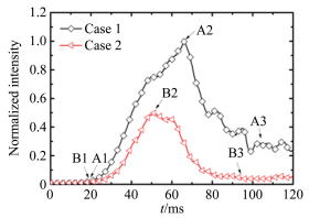 | 图 3 点火过程中工况1和2总亮度值随时间的变化 Fig.3 Integrated chemiluminescence in observation area of case 1 and case 2 |