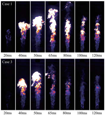 | 图 4 工况1和3的点火过程 Fig.4 Chemiluminescence images of ignition process for case 1 and case 3 |