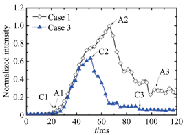 | 图 5 点火过程中工况1和3总亮度值随时间的变化 Fig.5 Integrated chemiluminescence in observation area of case 1 and case 3 |