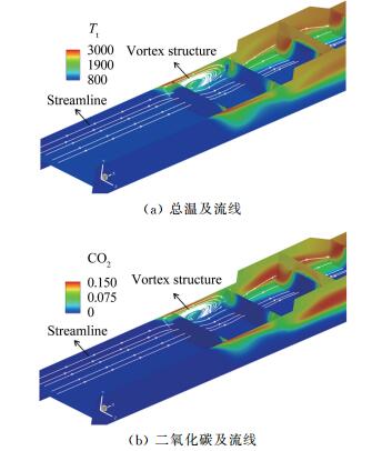 | 图 10 Case2状态下流道内总温、二氧化碳及流线的局部分布 Fig.10 Distributions of the total temperature、CO2 and streamline along the flowpath for Case2 |