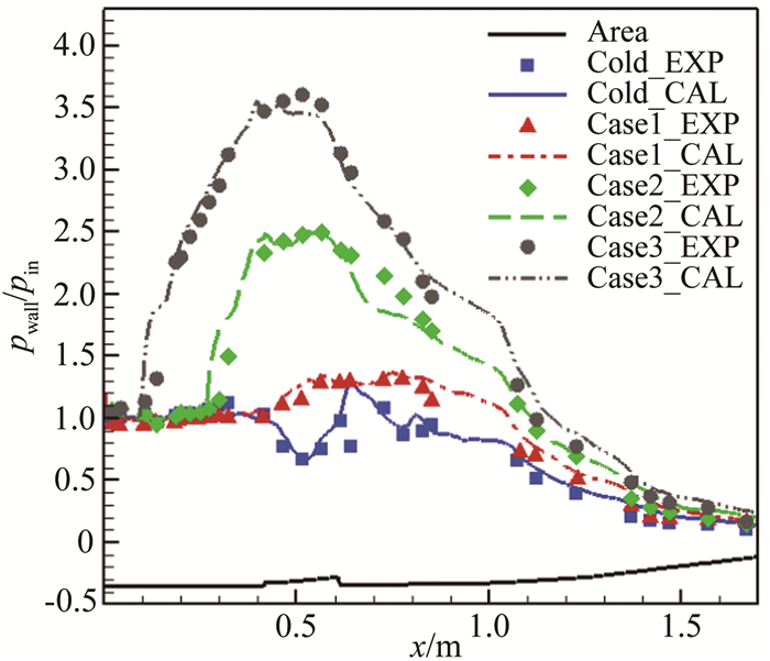 基于以上模态判别标准,本小节给出了Cold、Case1、Case2、Case3四个状态下无量纲侧壁面压力pwall/pin和质量平均马赫数Mamw沿流向的分布曲线,分析了流道参数的沿程变化规律,同时对注油状态的燃烧模态进行了分析。试验测得的侧壁面压力如图 3所示,图中同时给出了计算所得壁压,压力值均采用来流静压pin无量纲化,可见试验与计算所得的压力分布吻合得较好,验证了试验与计算结果的一致性。