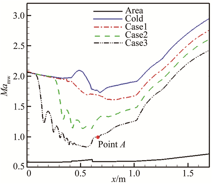 在燃料量继续提升的Case3状态下,由图 3可见,压升起点进一步向隔离段上游移动,隔离段内受反压影响的区域进一步扩大。与Case1和Case2一致,压力峰值位于凹槽区域内,同时图 4中所示质量平均马赫数继续降低,在凹槽附近区域达到亚声速状态。图 4中的A点即为热力喉道的壅塞点,位于凹槽后约0.06m处,此处平均马赫数恰为1。向隔离段上游传播的逆压梯度激波串和热力喉道的同时存在,表明了此时发动机处于双模态亚燃模态。可见,当量比增加改变了发动机的燃烧模态,不同模态下壁压与马赫数分布存在明显差异,正是这种差异给我们提供了一种区分模态的方法。