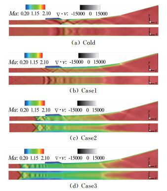 | 图 5 不同状态下发动机对称面马赫数及速度梯度云图 Fig.5 Centerline planes of Ma overlaid with ∇·V |