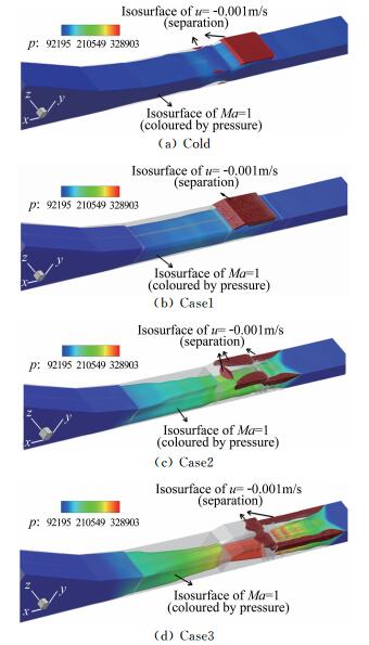 | 图 6 不同状态下发动机内Ma=1等值面及分离区示意图 Fig.6 Isosurfaces of Ma=1 and u=-0.001m/s for different cases |