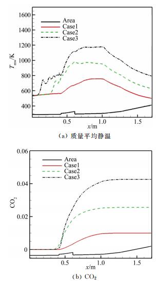 | 图 8 不同模态下流道内质量平均静温与二氧化碳沿程分布 Fig.8 Distributions of the mass average temperature and CO2 along the flowpath for different modes |