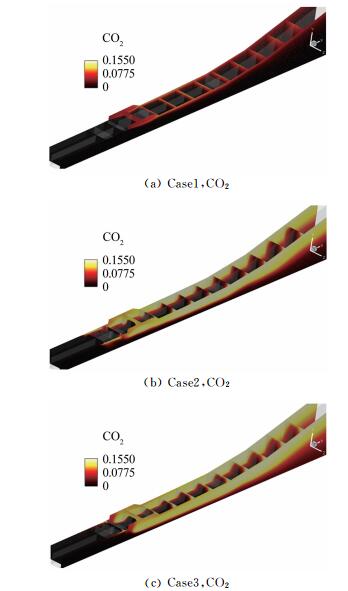 | 图 9 不同模态下流道内CO2分布 Fig.9 Distributions of CO2 along the flowpath for different modes |
