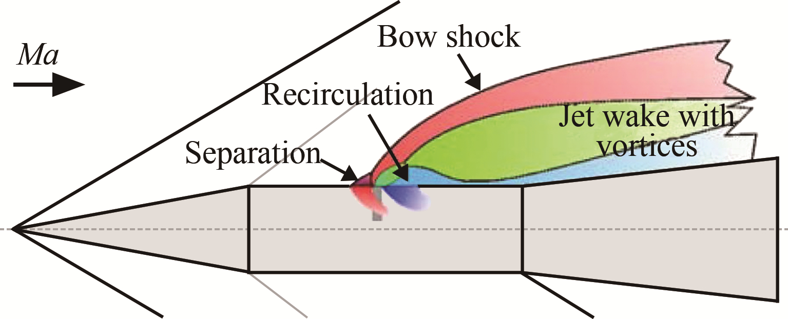 研究侧喷干扰流动的实验需要满足的条件远比常规外部绕流实验条件复杂。除需几何相似、来流马赫数相等外, 喷流压比、喷流组分、反应过程等也需相似, 这样的实验条件已有技术很难严格实现。几十年来, 研究者针对侧喷干扰流动开展了大量的实验与计算研究(实验包括冷喷流、高温空气和热喷流实验, 计算包括冷喷流、高温异质喷流、无反应冻结流和反应流模拟[1-24]), 得到了重要的定性定量结论, 加深了对侧喷干扰流动现象及其规律的认识。