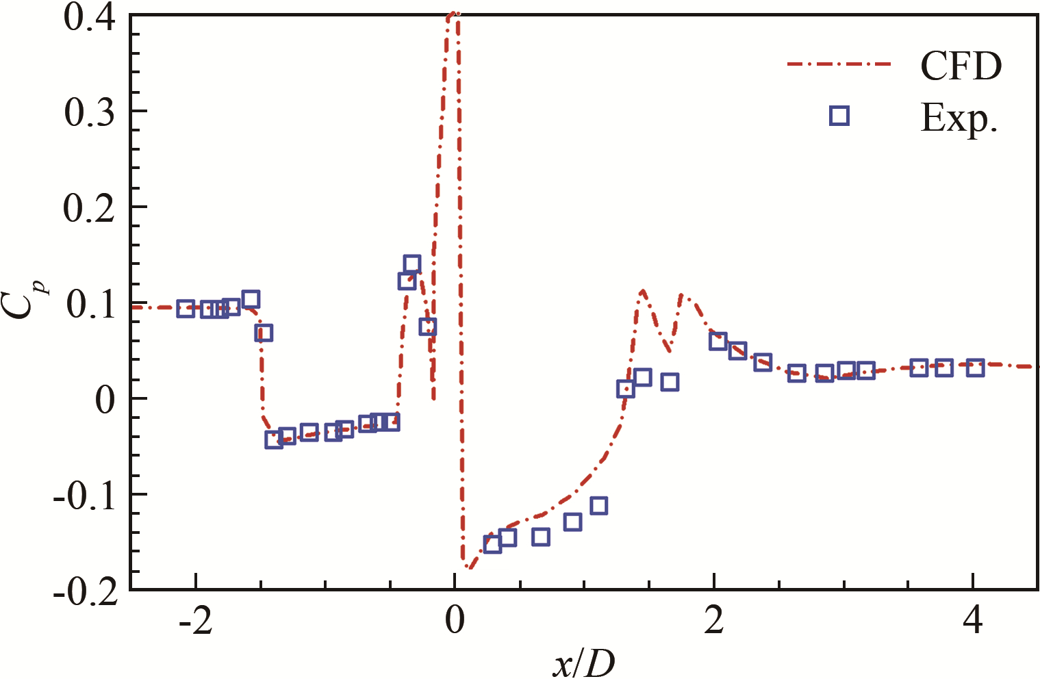 喷流直接力控制系统在高空提供近似等于推力的控制力, 提供的力矩主要由推力作用线与转轴的相对位置决定, 基本不引起干扰力和力矩, 对喷口周围物面的气动加热也不明显。但当高度降低至20~30 km时, 来流与喷流产生复杂的侧喷干扰效应, 形成强烈的激波/激波、激波/边界层干扰流动结构(如图 1所示), 产生明显的干扰力、力矩以及极高的局部气动加热。图 2为侧喷干扰轴向压力系数Cp分布的计算与实验结果对比[1], 在喷口附近出现很高的压力峰值, 气动热环境分布也有类似趋势。
