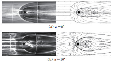20世纪80年代, 计算流体力学在侧喷干扰气动研究方面取得长足进展。20世纪90年代至今, 侧喷干扰流动模拟技术进入发展高潮, 在计算方法和物理模型方面均取得重大进步[1-4, 15-24]。实验与数值结果的对比, 证实了合理的数值模拟模型参数设置可以得到与实验较为一致的结果(如图 3所示), 为采用数值模拟手段广泛开展侧喷干扰研究提供了依据。同时, 从图 3也可看到, 侧喷干扰对来流条件变化非常敏感, 迎角α的变化在很大程度上改变了极限流线分布, 对受力和加热分布也会有潜在的重要影响。