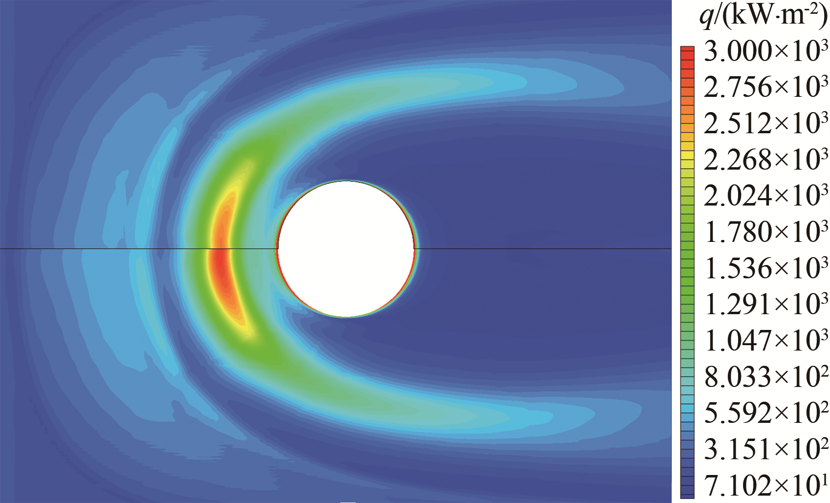 图 5为高度h=20 km、迎角α=0°时冷喷流与高温反应喷流干扰区域流线与压强p分布对比。可以看到, 2种计算模型峰值压强数值接近, 在喷口前(图中左侧)均有2个流线集中的位置, 左为分离位置, 右为再附位置, 两位置间为激波/边界层干扰旋涡分离区域, 喷口和再附位置间为另一较小的旋涡分离区域, 两分离区域在再附位置汇合引起局部高压。冷喷流模型再附位置更靠近喷口, 但激波/边界层分离区域稍宽, 其他状态下(如α=-4°和4°时)也有这一显著特征。图 6为热流密度q对比, 正如所预测的那样, 冷喷流比高温反应喷流模型的数值小一个量级, 这也是冷喷流实验通常仅用于气动力特性研究的主要原因。