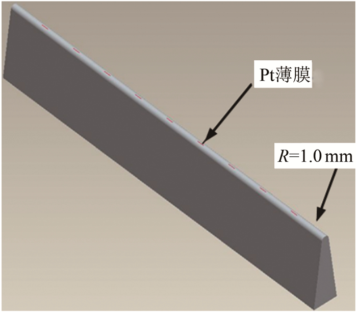 1 传感器研制为解决传感器测量端面对前缘型面的破坏, 采用一体化技术将薄膜电阻温度计与模型结合到一起, 在尖前缘外形的玻璃基底上进行镀膜, 制成整体式传感器。用于热流测量的温敏铂薄膜长度为2.0 mm, 宽度为0.2 mm, 薄膜长度方向与前缘纵向一致, 如图 1和2所示, 由于无后掠二维前缘驻点热流沿长度方向不发生变化, 因此在前缘无后掠的情况下, 薄膜长度对驻点热流测量没有影响。按连续流Lees二维圆柱热流计算公式[17], 对于R=1.0 mm前缘, 0.2 mm宽的薄膜所覆盖的前缘周向角为11.5°, 薄膜宽度引起的热流测量误差小于0.2%, 可以忽略。上述分析表明, 整体式传感器以及沿前缘长度方向镀膜的方案满足尖前缘驻点热流测量的需要。