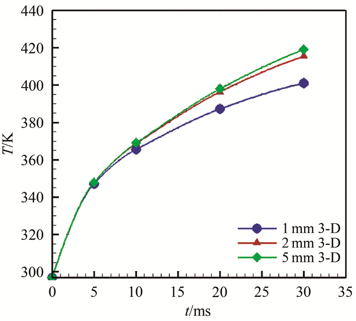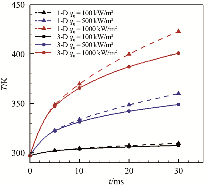 采用有限体积法的离散格式, 研究了前缘半径和试验时间对热流计算结果的影响。基底材料初始温度为297.15 K, 图 5为加载不同热流条件下半径1 mm的前缘表面温升。从图 5可以看出, 随着加热时间的增加, 采用一维热传导和三维热传导计算获得的表面温升差距越来越大, 因此加热时间越长三维热传导现象越严重; 在前缘加载30 ms的1000 kW/m2热流, 采用一维热传导和三维热传导计算获得的模型表面温差超过了20 K。因此, 在前缘热流测量中, 三维热传导现象不能忽略。