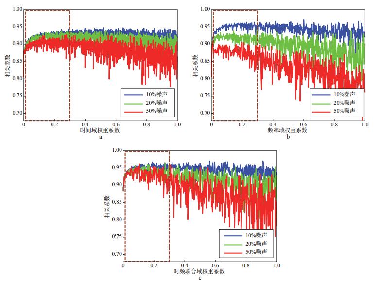 为了讨论本方法中时间域和频率域地震响应的权重系数对反演精度的影响, 对时间域贝叶斯反演、频率域贝叶斯反演及时频联合域反演中的权重系数进行分析, 结果如图 8所示。从图 8可以看出, 随着地震响应权重系数的不断增大, 3种方法的反演结果与理论模型的相关系数呈现先增大后减小的趋势。其中, 随着噪声含量的不断增加, 时间域反演表现出较强的稳定性(反演精度基本一致); 随着噪声含量和频率域响应权重的增加, 频率域反演却表现出反演精度剧烈下降的趋势, 进一步证实了频率域反演对噪声敏感的问题。值得注意的是, 在低噪声情况下, 频率域反演结果比时间域反演结果的精度高。本文方法建立在时间域反演稳定性强的前提下, 改善了频率域反演对噪声敏感的问题, 尤其在强噪声情况下提高了反演结果的精度(图 8c矩形框)。