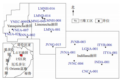 1 工区概况Oriente盆地15区块位于盆地中北部, 地理上位于厄瓜多尔亚马逊平原区; 构造上处于盆地向前隆过渡的斜坡部位, 构造倾角平缓, 多小于2°。L-I-Y油田是15区块的一部分, 面积约246 km2(图 1)。