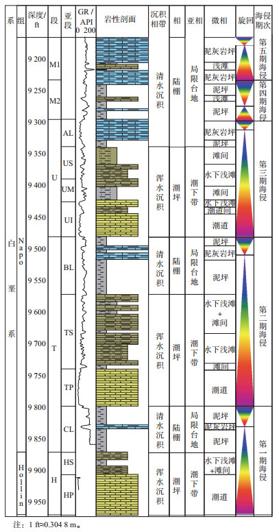 根据岩心、测井、录井资料综合判定, 研究区Hollin组-Napo组沉积时共经历了5次海侵, 第一、第二和第三期海侵的中部、下部沉积石英砂岩, 顶部沉积页岩、泥灰岩、泥岩及少量灰岩, 第四、第五期海侵主要沉积泥灰岩、灰岩、泥岩和页岩(图 2), 具有碎屑岩—碳酸盐岩混合沉积特征。从Hollin组H段和Napo组T段、U段岩心观察看, 块状层理、大型交错层理、再作用面、斜层理、双黏土层、潮汐成因层理等沉积构造发育, 并可见瓣腮类生物碎屑, 发现海绿石(图 3), 说明处于浑水沉积相带的HP, HS, TP, TS, UI, UM, US亚段不具备河流、三角洲沉积特征, 属于受潮汐控制的潮坪沉积环境; 处于清水沉积相带的CL, BL, AL亚段和M2段、M1段为陆棚沉积环境。在上述沉积模式控制下, 根据岩性、沉积构造、古生物、测井等多种资料, 将潮坪相分为潮下带、潮间带、潮上带3个亚相, 进一步分为潮道、潮道侧积砂坪、潮道间、水下浅滩、滩间、混合坪、水上浅滩、泥坪共8种微相, 其中潮道、潮道侧积砂坪为最有利沉积微相; 陆棚相沉积环境发育局限台地亚相, 进一步分为砂坪、泥坪、泥灰岩坪、页岩坪和灰坪5种微相(表 1)。