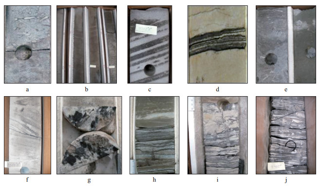 图 3 岩心观察的沉积构造及古生物特征 a块状层理, 含海绿石, CNCA-001井U段9 370.0 ft; b大型交错层理, JVNC-004井H段9 766.0~9 770.0 ft; c再作用面、斜层理, JVNC-004井T段9 512.4 ft; d双黏土层, JVNB-003井T段9 570.0 ft; e瓣鳃类生物碎屑, CNCA-001井T段9 544.0 ft; f前积砂纹层理, JVNC-004井T段9 546.6 ft; g植物碎片, JVNB-003井U段9 365.0 ft; h前积砂纹层理、波状层理, JVNB-003井T段9 519.0 ft; i透镜状层理、生物钻孔, JVNA-001井U段9 296.2 ft; j透镜状层理JVNC-004井T段9 480.0 ft |