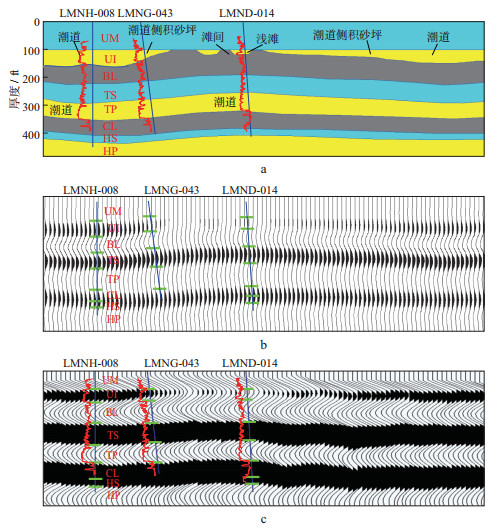 基于潮坪沉积模式, 以UM, UI, BL, TS, TP, CL, HS, HP的速度(10 662.73, 11 305.77, 10 387.14, 11 847.11, 12 352.36, 12 916.67, 13 887.80, 14 763.78 ft/s)作为层速度建立正演模型, 采用主频为30 Hz的雷克子波、二维声波方程进行正演模拟(图 4)。正演模型中, 不同砂体厚度代表不同的沉积微相:砂体厚度大于60 ft代表潮道微相, 砂体厚度为30~60 ft代表潮道侧积砂坪, 砂体厚度10~30 ft代表浅滩微相, 小于10 ft代表泥坪微相(图 4a)。从正演结果看(如UI亚段), 潮道微相具有强振幅、下切特征; 潮道侧积砂坪表现为中振幅且振幅向边缘逐渐减弱的地震特征; 浅滩微相为弱—中振幅-差连续地震相; 滩间等低能沉积环境表现为空白反射地震特征(图 4b)。正演结果与实际地震反射特征对比可见, 两者具有较好的对应关系(图 4c)。