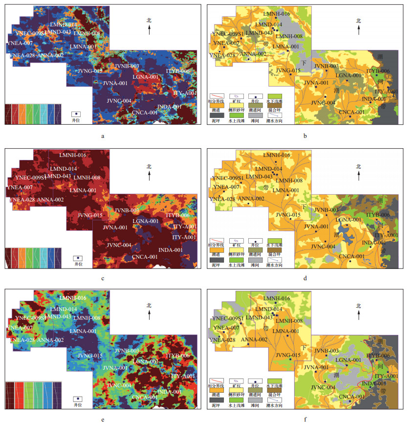 根据以上分析, 利用振幅和波形聚类等地震属性, 对H段、TP亚段和UI亚段地震相进行了归类分析(图 5)。从波形聚类图上看, 北西—南东向波形相似度高, 呈条带状展布, 其中Hollin组H段紫红色、天蓝色区域分布于东部和JVNG015—LMND014以北一带, 其余区域主要为蓝色、紫色(图 5a); Napo组的TP亚段紫色、黄色区域主要分布在东部, 其余区域主要为砖红色、紫红色(图 5c); Napo组的UI亚段紫红色、红色、黄绿色区域集中分布在东南部和西北部, 而紫色、天蓝色区域分布在中部(图 5e)。在地震属性分析的基础上, 结合砂地比及测井相资料落实了沉积微相平面展布特征: