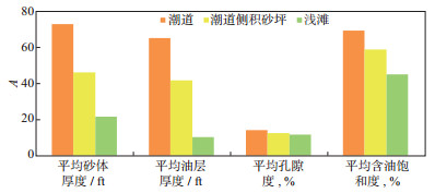 4 有利沉积微相与含油性从沉积微相描述与已钻井结果对比看, 平面上, 不同沉积微相具有不同的油层厚度、含油饱和度特征。潮道微相储层的平均渗透率为1 085.9×10-3μm2, 砂体厚度和油层厚度大, 物性好, 含油饱和度最高; 潮道侧积砂坪储层的平均渗透率为864.4×10-3μm2, 砂体厚度和油层厚度次之, 物性好, 含油饱和度较高; 浅滩微相储层的平均渗透率为690.7×10-3μm2, 砂体厚度和油层厚度最小, 物性较差, 含油饱和度较低(图 6)。
