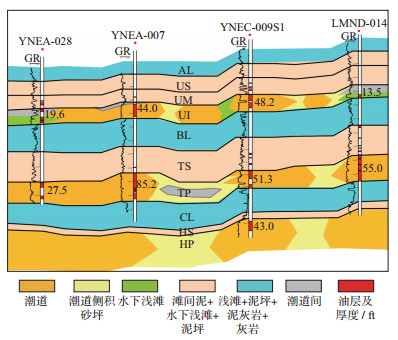TP亚段位于第二期海侵早期, 主要发育潮道和潮道侧积砂坪, 油层厚度在1.0~85.4 ft之间, 平均油层厚度为30.2 ft, 其中YNEA-007井TP亚段油层厚度85.2 ft(图 7)。