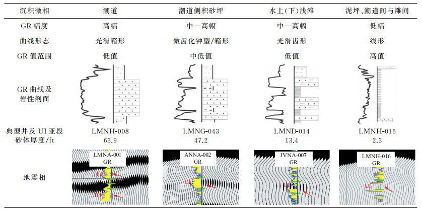 3.1 沉积微相地震识别通过精细井震标定, 在地震资料上潮道微相表现为中振幅-较连续-平行、亚平行-席状地震相, 例如LMNA-001井TP, HP亚段(表 2)。潮道侧积砂坪在潮道边缘沉积形成, 该微相的振幅比潮道微相稍弱, 为中振幅-较连续-平行、亚平行-席状地震相, 例如ANNA-002井UI亚段(表 2)。浅滩微相横向上连续性差, 地震上多表现为弱—中振幅-差连续-平行、亚平行-席状地震相, 例如JVNA-007井UI亚段(表 2)。混合坪微相为砂泥薄互层沉积, 弱振幅-差连续-席状地震相。泥坪、滩间、潮道间等微相为宁静水体沉积物, 是弱振幅—空白地震相, 例如LMNH-016井UI亚段。CL, BL, AL亚段沉积的页岩、泥灰岩属于稳定的陆棚相沉积物, 为强振幅-连续-平行、亚平行-席状地震相。