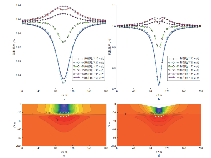 图 10 视极化率曲线 a含低阻高极化异常体的平坦地形视极化率曲线; b模型2的视极化率曲线; c含低阻高极化异常体的平坦地形视极化率断面; d模型2的视极化率断面 |