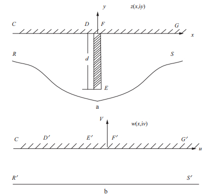 式中:x的正负与u相同; y的正负与v相同。对于给定的d和w(u, iv), 可根据(23)式计算w(u, iv)的对应点z在Z平面内的坐标(x, iy); 对于W平面内的直线R′S′, 可根据(23)式得到Z平面内对应的曲线RS。W平面内(相当于平坦地形下)的电位为: