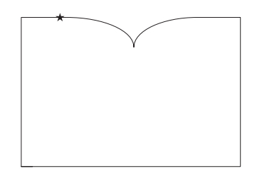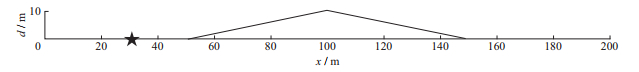 模型1:图 4, 图 5分别为山谷与山脊模型, 五角星均为源位置, 均匀介质, 各项参数如下:电阻率为1 Ω·m, 三极测量装置中测量电极M, N变化范围为0~200 m, 测量电极距2 m, 山谷模型网格剖分的计算区域为200 m×100 m, 扩展边界区域为10 000 m, 三角形网格单元数为21 151, 节点数为10 864;山脊模型网格剖分的计算区域为200 m×100 m, 扩展边界长度为10 000 m, 三角形网格单元数为21 261, 节点数为10 919。