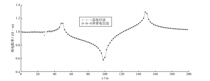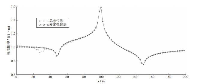 从图 6与图 7可以看出采用总电位法得到的山谷模型视电阻率曲线出现了高阻异常, 山脊模型的视电阻率曲线出现了低阻异常, 这与前人研究得出的地形与视电阻率呈镜像对称的规律相符[35]; 在源点附近, 采用总电位法得到的视电阻率出现了畸变, 这也验证了改进的异常电位法的正确性, 与总电位法得到的结果相比, 改进的异常电位法得到的视电阻率精度更高。