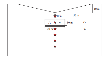 模型2:该山谷模型的各项参数如图 8所示, 围岩电阻率ρ0=100 Ω·m, 极化率η0=0.01, 低阻异常体电阻率ρ1=5 Ω·m, 极化率η1=0.2, 异常体宽度20 m, 厚度10 m, 埋深10 m, 网格剖分的计算区域为200 m×100 m, 扩展边界长度为10 000 m, 生成三角形网格单元数为16 169, 节点数为8 253。五角星为源在井中的位置, 采用井地二极观测方式, 视电阻率计算公式为:ρs=πu/ln(1/r)。