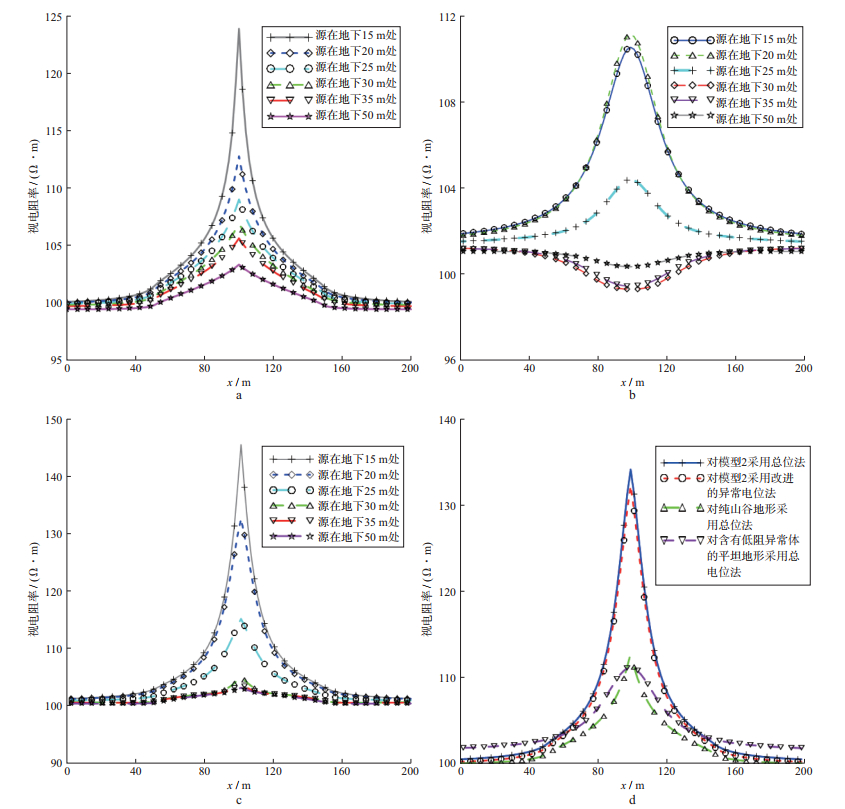 图 9 视电阻率曲线 a纯山谷地形的视电阻率曲线; b含低阻异常体的平坦地形视电阻率曲线; c模型2的视电阻率曲线; d不同地形条件下采用不同方法得到的视电阻率曲线(源在地下20 m处) |