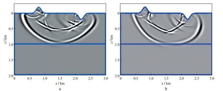 模型从上至下分为两层, 模型参数分别为C110=10.0GPa, C130=2.5GPa, C330=6.0GPa, C550=2.0GPa, C110=16.0GPa, C130=4.48GPa, C330=16.0GPa, C550=5.76GPa。模型网格大小为301×201, 网格间距为10m。震源为主频20Hz的雷克子波, 时间采样间隔0.6ms, 震源位于(1500m, 10m)处。图 19a和图 19b分别为模拟得到的VTI介质和TTI介质0.45s时刻的水平分量波场快照。从图 19可以看出, 在qSV波三叉区, 山峰、山谷相当于二次震源, 所有经过山峰、山谷的地震波都会激发出反射波和转换波, 极大地丰富了地震波场, 增加了波场复杂性。总之, 起伏地表的存在使得地震波在地下各向异性介质中的传播模式发生了很大变化, 使波场变得更加复杂。