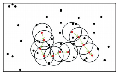图 1中给定邻域和密度阈值(MinPts=5), 红色样本点为核心点, 黑色样本点为非核心点, 可以看出以邻域为半径, 红色核心样本点为中心的圆形区域内的样本点满足密度直达条件, 不在该圆形区域内的样本点不满足密度直达条件。图 1中绿色箭头连接的核心点为满足密度可达条件的样本序列, 在邻域内该序列的所有样本点密度相连, 因此这些点可划分为同一类簇。
