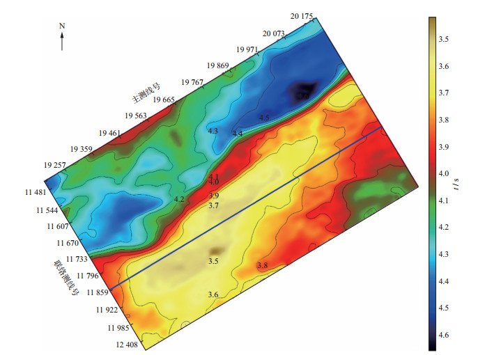 以地震解释得到的特征反射格架层T50, T60, T70, T100为基础, 根据地震沉积学原理, 将上述特征反射格架层细分为相应的地层切片, 图 10为目标区联络测线855的地层切片解释剖面。图 11是解释层位T100的等t0结果, 可以看出目标区东南部是构造高点, 西北部是构造斜坡带。