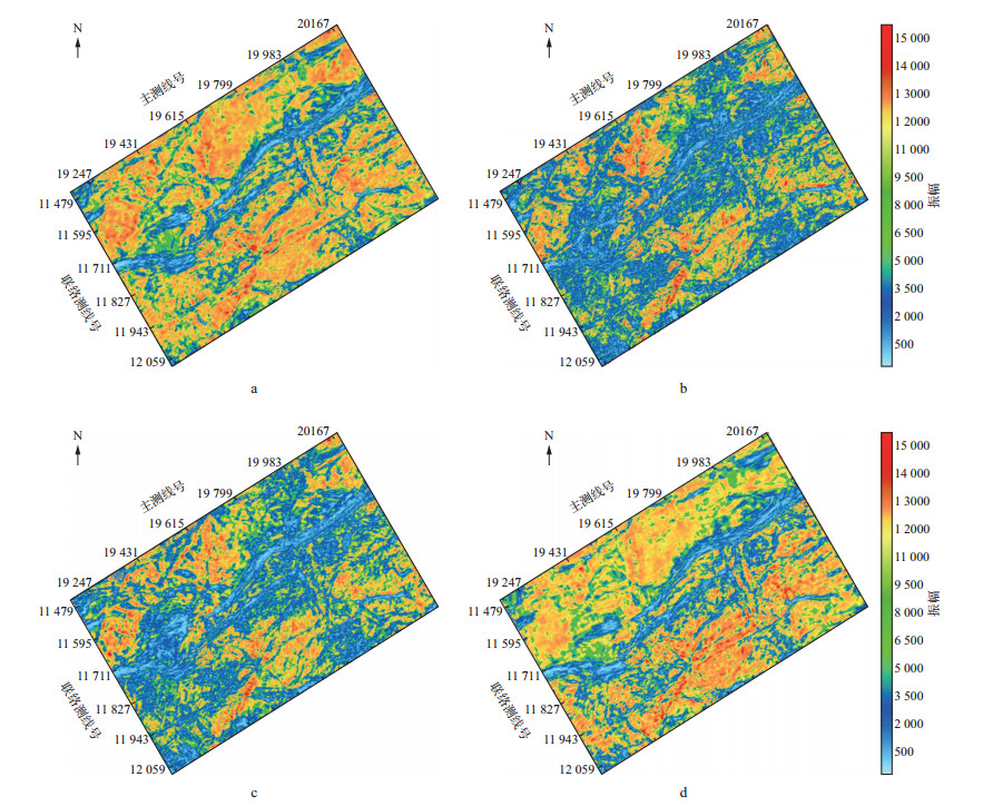 图 12 全角度及不同角度道集叠加地震数据沿T100层切片的RMS振幅属性 a全角度; b角道集(3°~9°); c角道集(15°~21°); d角道集(27°~33°) |