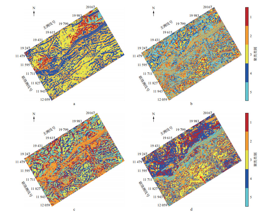图 13 全角度及不同角度叠加地震数据沿T100层切片的波形聚类属性(ε=0.3, MinPts=5) a全角度; b角道集(3°~9°); c角道集(15°~21°); d角道集(27°~33°) |