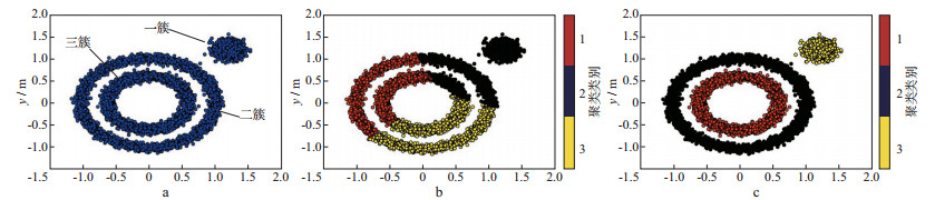 图 2 采用不同方法聚类分析的结果 a 3簇随机数据; b K均值聚类方法; c DBSCAN方法 |