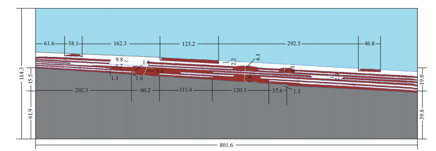 图 5 三维地层物理模型砂体垂向剖面(单位:mm) |