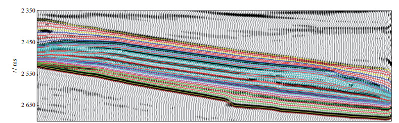图 6 某条主测线的克希霍夫积分时间偏移的地震剖面及等时地层切片解释剖面的叠合显示 |