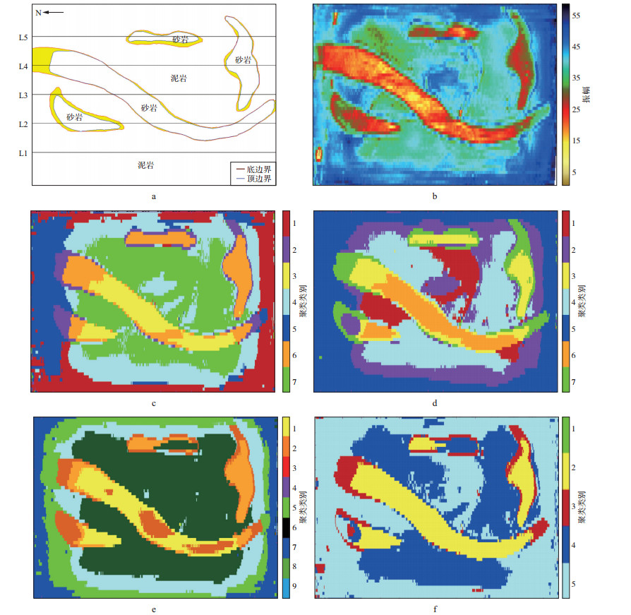 图 8 第1层模型平面形态及沿地层切片提取的均方根振幅属性和采用DBSCAN方法得到的波形聚类属性 a第1层“蛇形”砂体顶、底叠置显示的平面形态; b均方根振幅属性; c波形聚类属性(ε=0.3, MinPts=5, 波形向量31维, 聚类类别为7类); d波形聚类属性(ε=0.2, MinPts=5, 波形向量21维, 聚类类别为7类); e波形聚类属性(ε=0.15, MinPts=4, 波形向量31维, 聚类类别为9类); f波形聚类属性(ε=0.4, MinPts=7, 波形向量31维, 聚类类别为5类) |