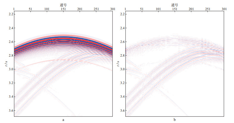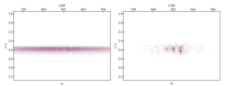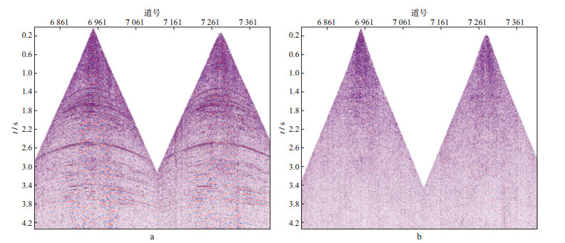 西部某探区地下缝洞发育, 实际地震资料中发育有由大量缝洞产生的绕射波, 利用本文SVD方法对原始数据进行了反射波和绕射波分离。图 5a为原始单炮记录, 图 5b为分离后的绕射波单炮记录, 制图时采用相同的能量色标。在分离后的单炮记录上由于绕射波能量弱, 尽管看不到明显的绕射波能量, 但是强能量的反射同相轴被明显压制。