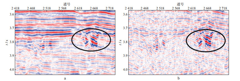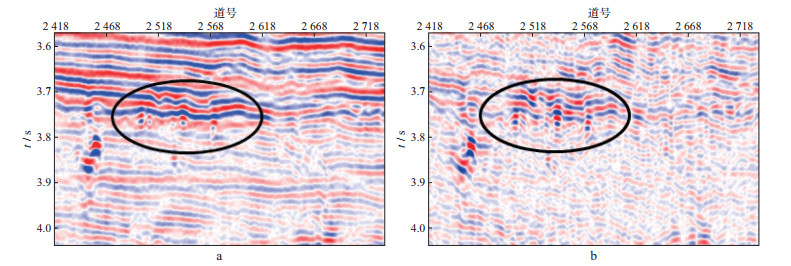 同样采用Kirchhoff叠前时间偏移对原始单炮记录和分离后的绕射波单炮记录进行成像。图 6a为测线a的部分常规偏移剖面, 其中强反射界面附近的多处“串珠”被强反射波掩盖, 如图中黑色椭圆处所示, 这给后续地震资料解释工作带来困难。图 6b为分离后的绕射波偏移结果, 可以看出, 目标体“串珠”清晰地显示出来, 有利于后续正确识别缝洞储集体和评估、计算油气资源量。图 7a和图 7b分别给出了测线b的部分常规偏移和绕射波偏移剖面。对比图 7a和图 7b中黑色椭圆处可以看出, 绕射波偏移剖面中的“串珠”更加聚焦, 横向分辨率得到较好改善。