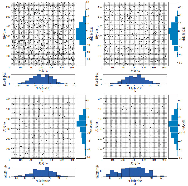 图 1展示了该组实验中采样比不同时检波点的分布情况。其中:图 1a至图 1d分别为在规则基础网格上抽稀到72.25%, 42.25%, 12.25%及6.25%的结果。图中黑点代表空间随机的检波点位置, 右边矩形图代表沿Crossline方向检波点扰动量分布; 下边矩形图代表沿Inline方向检波点扰动量分布。由图可见, 检波点坐标在Inline和Crossline方向的统计特征符合离散高斯分布。在图 1d中, 相对于基础网格, 由于只保留了6.25%的数据采样导致检波点数目过少, 因此检波点坐标的统计特征与高斯分布存在一定偏差, 进而会影响数据重建的质量。