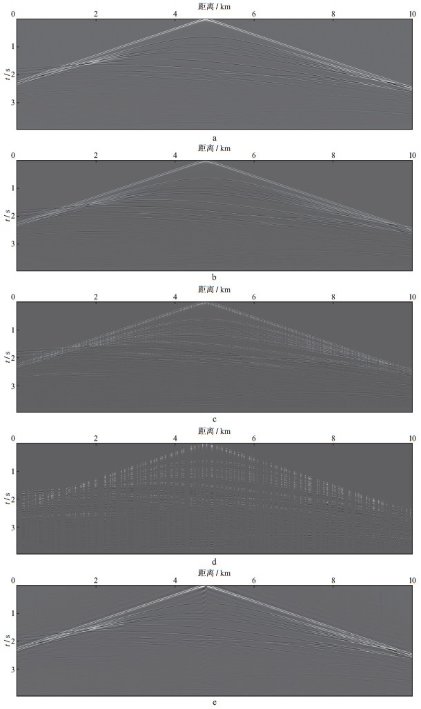 图 10 第120炮地震记录 a 均匀采样10 m间隔; b 均匀采样20 m间隔; c 均匀采样40 m间隔; d 压缩感知采样, 10 m规则网格抽稀12.5%结果; e 压缩感知恢复至10 m规则采样结果 |